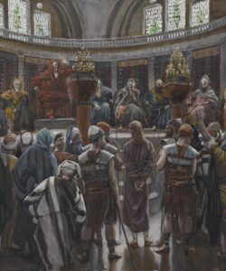 Our Lord was at first taken before Annas, the father-in-law as we have seen of the High Priest, but since he was no longer in office it was beyond his competence to judge our Lord when He appeared before him. The affair had been mismanaged and had to be referred to the tribunal of the real High Priest, Caiaphas. He awaited Jesus, in another wing of the Palace, seated, according to custom, with legs crossed, on a slightly raised platform. Around him on the ground, on cushions set in the form of a semicircle, were grouped the other priests. The proceedings were illegal because while they should have taken place in the daytime with witnesses present, it was actually two o’clock in the morning, and such witnesses as there were detected in flagrant imposture. Then Joseph Caiaphas, overpowered by rage, solemnly called upon our Lord to tell him if He were the Christ, a measure quite contrary to the Roman Law which in such a case invalidates the confession of the accused; and our Lord who had waited for this moment before speaking, formally declared His Divinity before the Jewish religious authority in full council assembled. They then found Him worthy of death, a sentence which He accepted since it was precisely His character as Son of God which enabled Him to give an infinite value to the sacrifice which He was about to offer to God the Father for His brethren, the sons of men.”